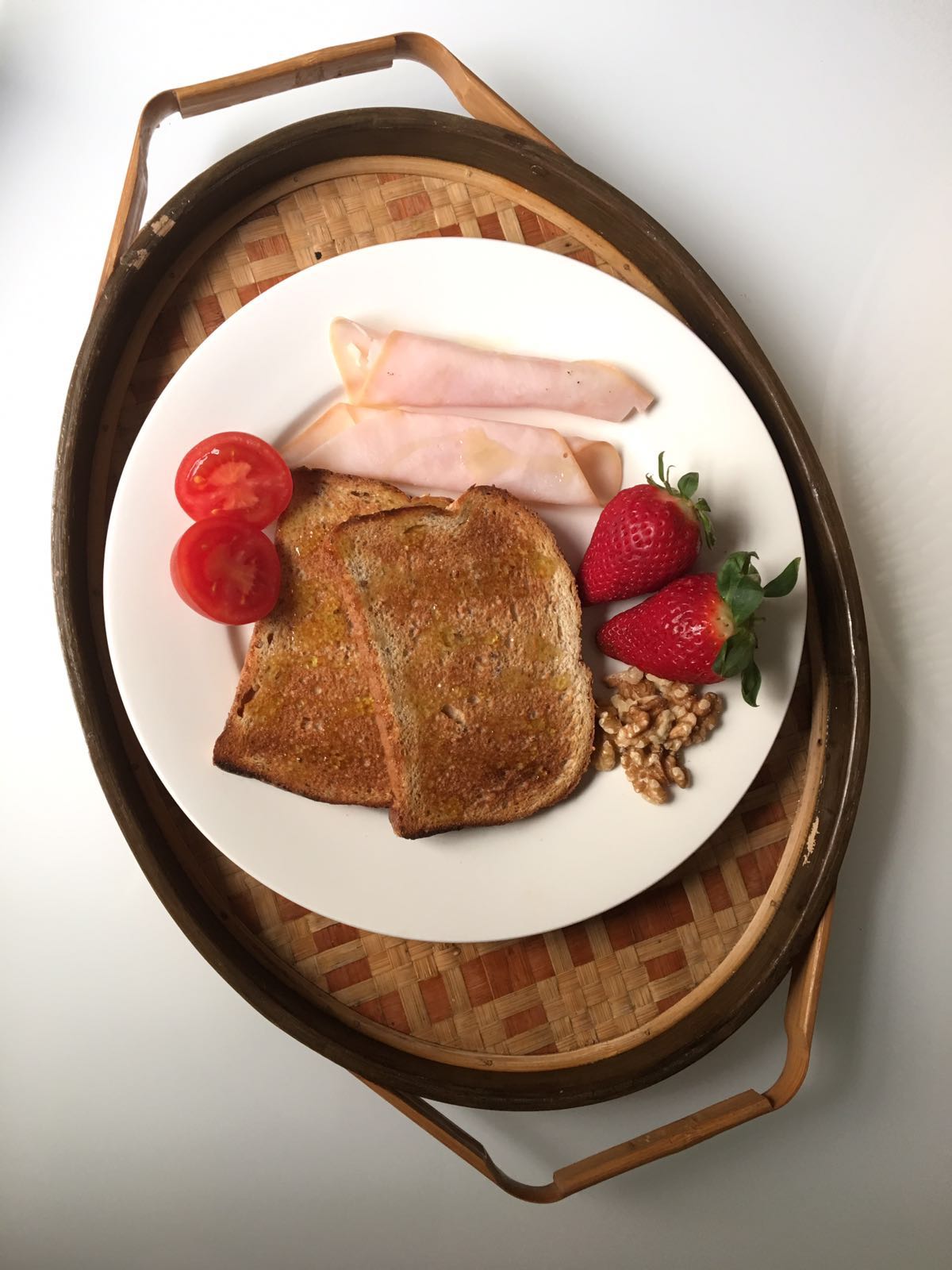 Tostadas con pavo, nueces y fresas.